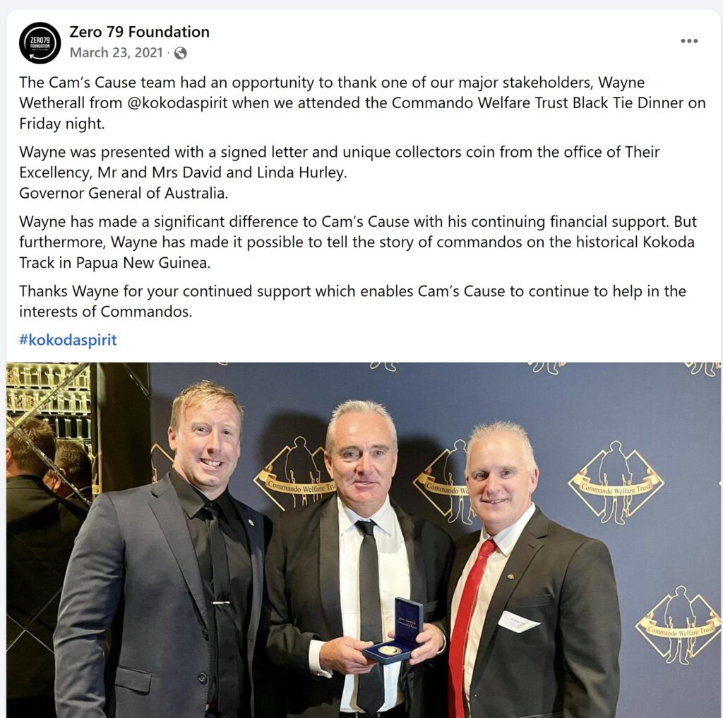 Rather than cut ties with his mate, Chris Dyer announced Cam’s Cause was embarking on a new journey with the establishment of a Zero 79 Foundations after ‘the successful fulfillment of its mission ‘to support the commando and veteran community in honour of Corporal Cameron Baird, VC MG’ on 14 September 2023.