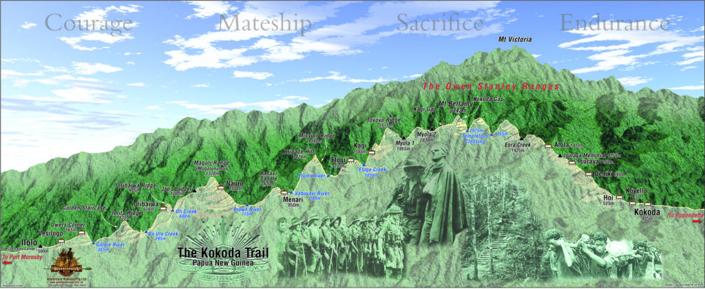 ”Kokoda Trail’ was the offical name of the waritme tracks between Owers’ Corner and Kokoda gazetted by the PNG Government in 1972 (PNG Government Gazette No. 88 of 12 October 1972, page 1362, column 2. Notice 1972/28 refers). The gazetted area extends to 10 metres either side of the Trail. It is also the name of the Battle Honour, awarded to the Papuan Infantry Battalion and the 10 Australian battalions who fought in the Kokoda campaign, by the Commonwealth Battles Nomenclature Committee in 1953.