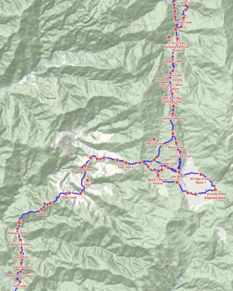 To overcome this, I used to fly to PNG, engage a few of our guides and some local landowners across various sections of the Trail, and use the Army Survey Corps map to plot the original Trail. During this process, I learned that every feature, rockface, creek, and similar element had a name. I would then ask the landowner to spell it phonetically and enter it into my GPS. This was a time exercise as I also learned that many of the younger guides are not aware of the indigenous names.