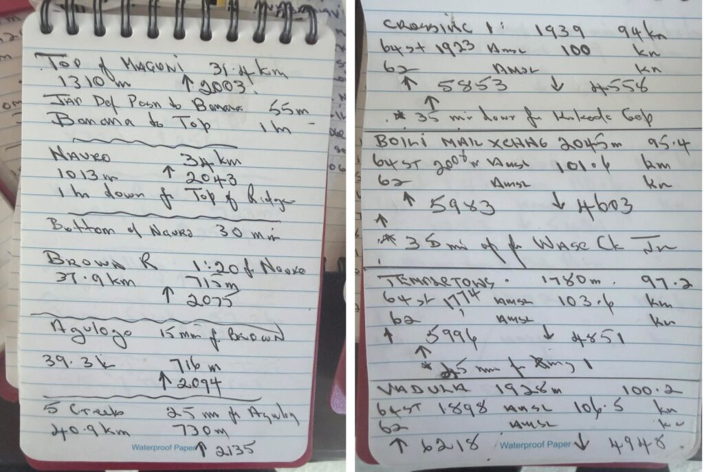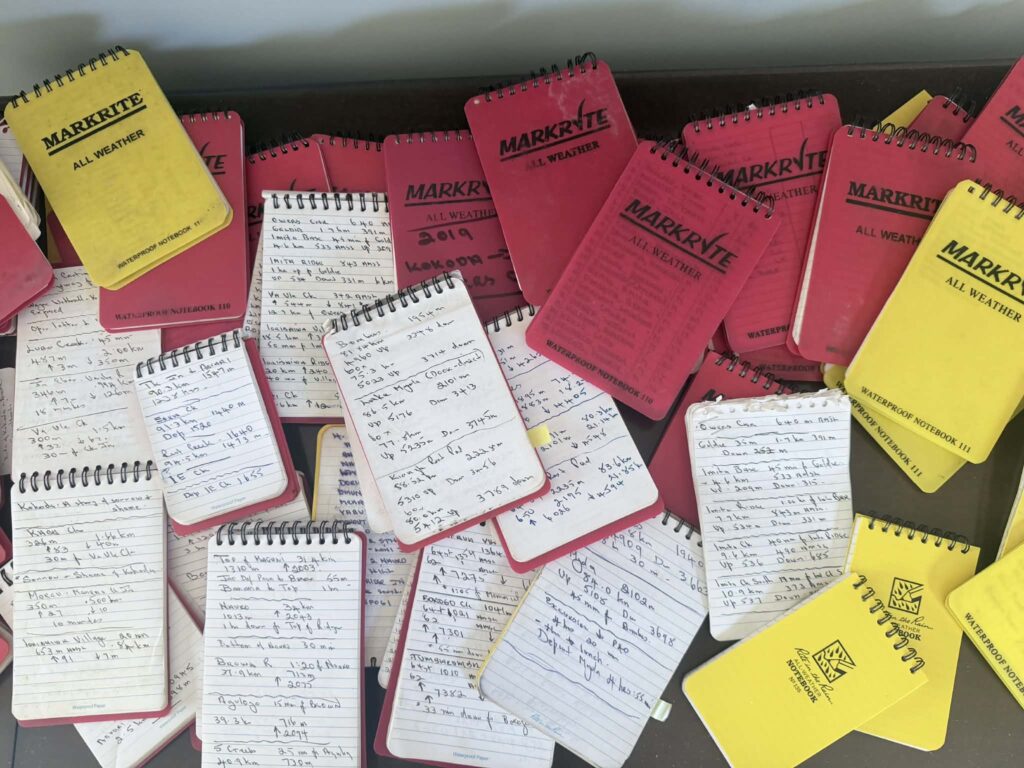 I also recorded the times, distances and names in waterproof notebooks on every trek I completed between 2010 and 2023. This was an interesting exercise, as I had to be mindful to turn off my GPS whenever we stopped at a campsite or feature, so it would not record the distance I walked around each location. This ultimately led to the conclusion that the distance of today’s Kokoda Trail between Owers Corner and Kokoda is 124 km, with a total ascent of 6,658 metres and a total descent of 6,683 metres. Groups that include Lake Myola 1 and 2 will trek a total distance of 152 km, with a total ascent of 7,150 meters and a total descent of 7570 meters.